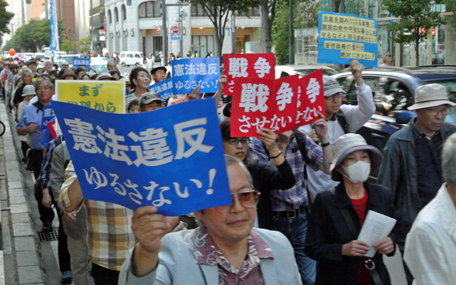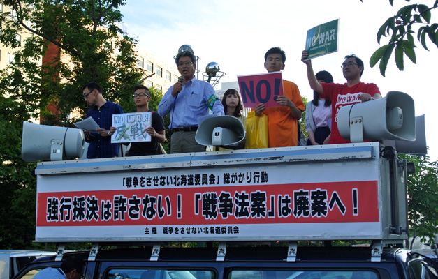 戦争させない北海道委員会は7月17日、大通公園西3丁目広場で『総がかり行動』を行った。街頭演説には1000人を超える市民が参加した。
