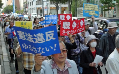 街頭演説後のデモパレードには、沿道からも市民が駆けつけ1200人が参加し、「戦争法案反対!」「アベの政治を許さない」「自民党感じ悪い」などシュプレヒコールで訴えた。