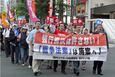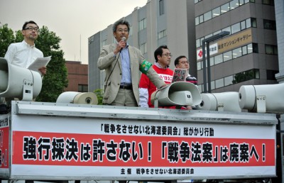 戦争させない北海道委員会呼びかけ人の北星学園大学・岩本一郎教授は「憲法学者がこれほどバカにされたことはない。安倍政権は国民の信託をゴミ箱に捨てているようなものだ。安全保障法案は戦争参加と国民をテロに巻き込む憲法違反だ」と批判した。