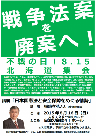 戦争法案を廃案へ!不戦の日!8.15北海道集会は8月16日(日)