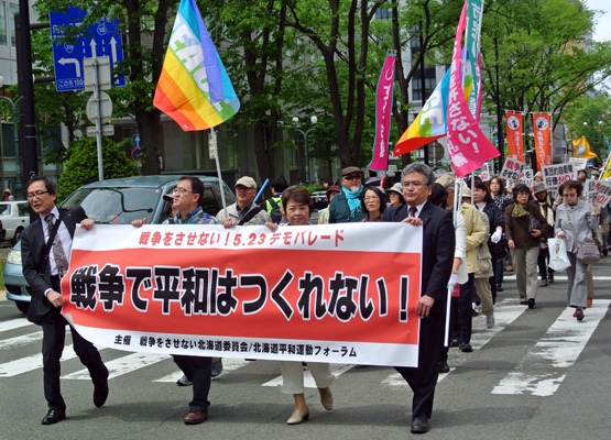 主催者を代表し、「戦争をさせない北海道委員会」呼びかけ人、結城・小樽商科大学名誉教授は、「第2次安倍政権発足以来、憲法無視し続け、立憲主義を否定している。『平和安全法制整備法案』『国際平和支援法案』は今後米国をはじめとする同盟国が行う戦争への参加であるため、このような暴挙を絶対に見過ごすわけにはいかない」と訴えた。