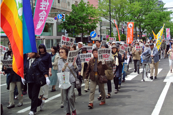 講演終了後、札幌市内中心部をデモパレードしながら、「集団的自衛権に反対!」「戦争法案の撤回!」のシュプレヒコールを行い市民にアピールした。