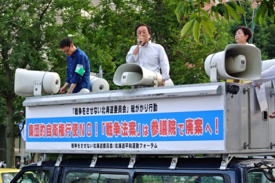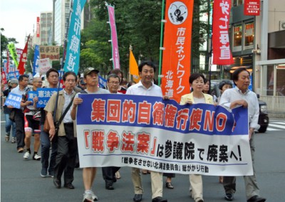 市民ネットワーク北海道・佐藤共同代表は「日本の平和な社会を、子どもたちに引き継いでいきたい。市民のみなさん一人ひとりの声がうねりをつくる。そして隣の方に声をかけて、さらに拡げなければならない。最後まで諦めずに、『憲法違反の戦争法案即時撤廃』と声をあげて、手を携えてがんばりましょう」と呼びかけた。