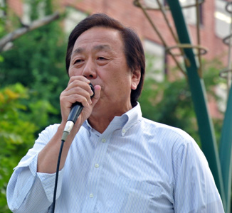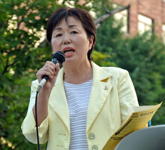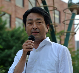 民主党幹事長・市橋道議は「子どもたちを戦争に送らない集会だ。戦後70年、日本が一度も戦争に参加していないことが日本人の誇りであり、世界からも高く評価されている。また、自衛隊は人道支援などで国際的に高い評価を受けている。一方アメリカでは、これ以上、戦争で兵士が戦死することは許されない世論が高まっている。アメリカの肩代わりをするような法案成立を絶対許してはならない」と訴えた。