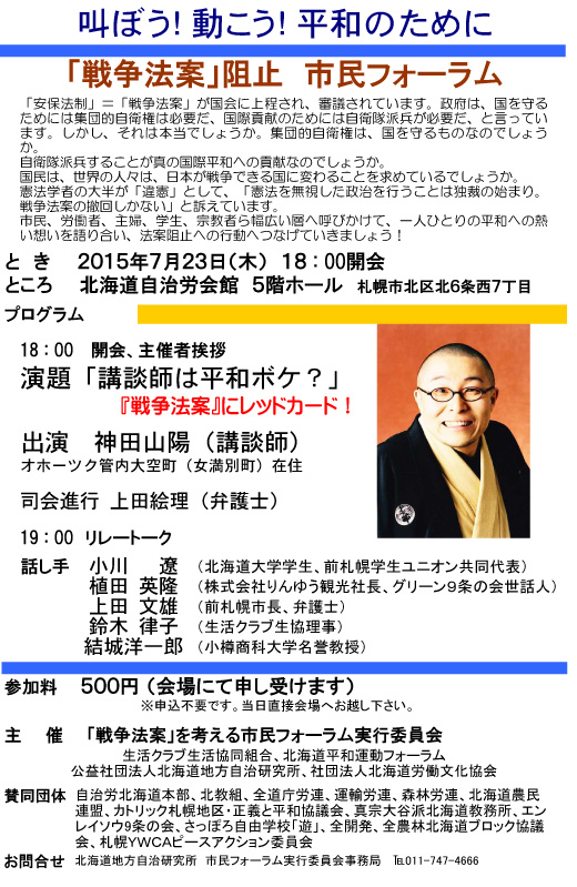 「戦争法案」阻止市民フォーラムは、本日7月23日に「叫ぼう!動こう!平和のために」を開きます。