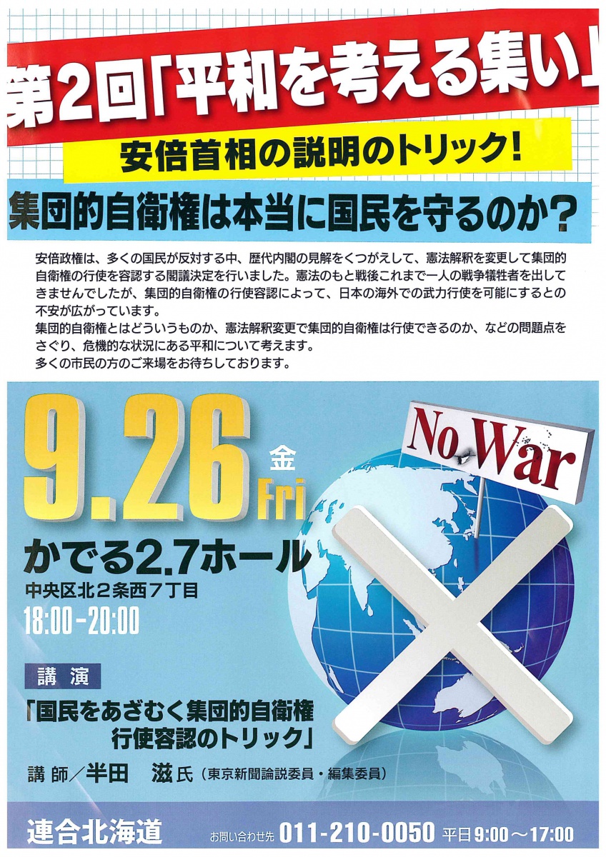連合北海道主催の第2回「平和を考える集い」安倍首相の説明のトリック!集団的自衛権は本当に国民を守るのか?は9月26日(金)に開かれます。
