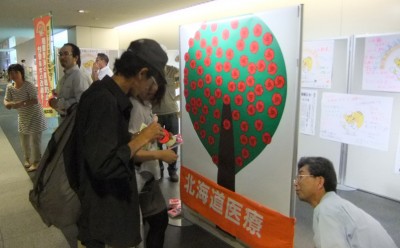 初の試みとして、通行人に私たちの訴えに対する賛同の思いを「花のシールを木に貼る」という行動で表現してもらった。約1時間の街宣行動で130以上の思いを頂いただけでなく、たくさんの励ましの言葉も頂き、地域との交流が図られた。