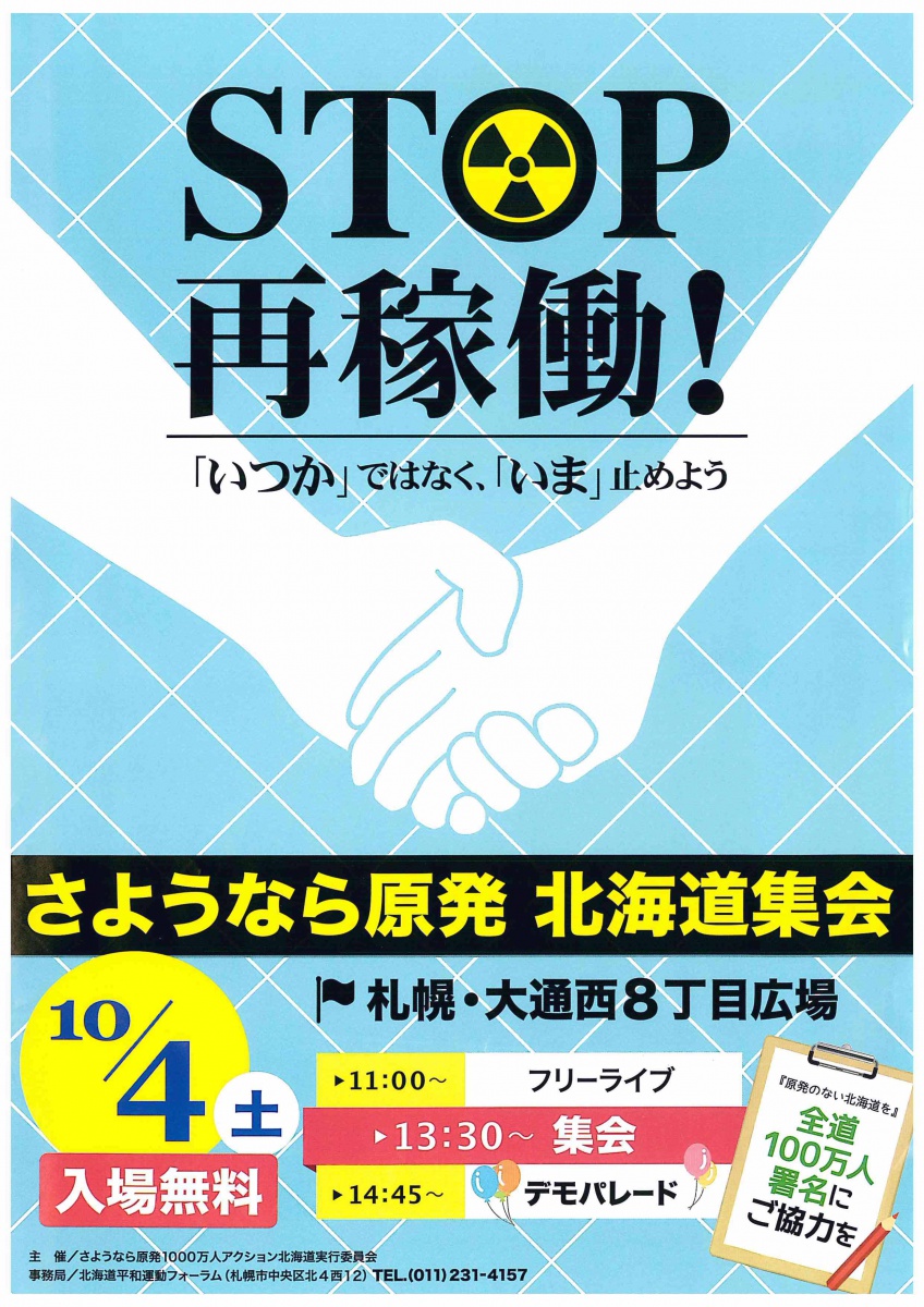 明日10月4日(土)、13時30分から「STOP!再稼働 さようなら原発北海道大集会」を開かれます。