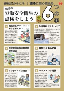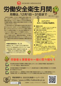 道本部では、現業職場のみならずすべての職場を対象として、労働災害が起こりやすい冬季および年末年始繁忙期の労働災害撲滅、労働安全衛生活動の活性化にむけ、12月を道本部独自の「労働安全衛生月間」と位置付け、「全ての職場を対象」に労働災害が起こりやすい年末年始繁忙期の労働災害撲滅、労働安全衛生活動の活性化に向けて取り組みを進めています。